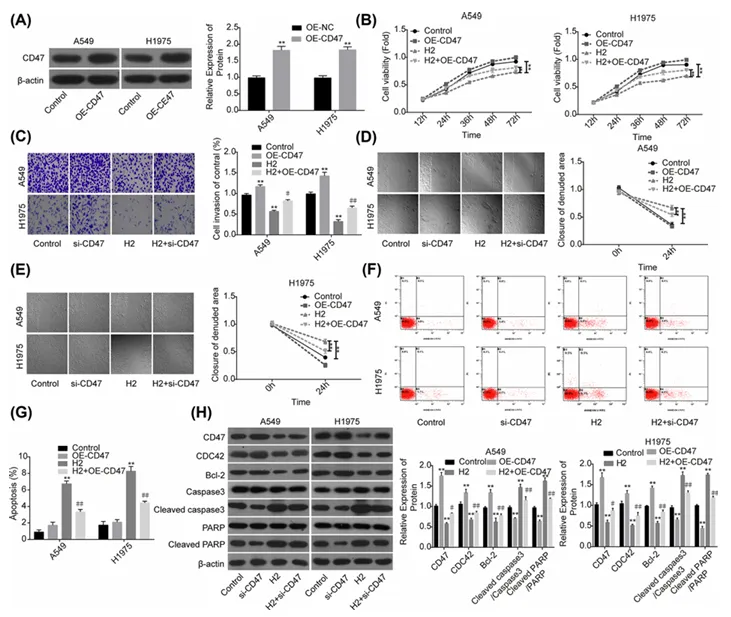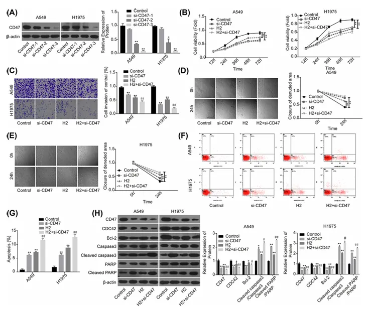 敲低CD47 (si-CD47) 本身就能抑制細(xì)胞增殖、侵襲和遷移,并促進(jìn)凋亡。更重要的是,敲低CD47與H?處理聯(lián)合應(yīng)用,在抑制肺癌細(xì)胞惡性表型和誘導(dǎo)凋亡方面表現(xiàn)出比單獨(dú)處理更強(qiáng)的協(xié)同效應(yīng)(圖3B-H)。分子水平上,聯(lián)合處理導(dǎo)致Bcl-2和CDC42表達(dá)進(jìn)一步降低,cleaved caspase3/caspase3和cleaved PARP/PARP比值進(jìn)一步升高(圖3H)。