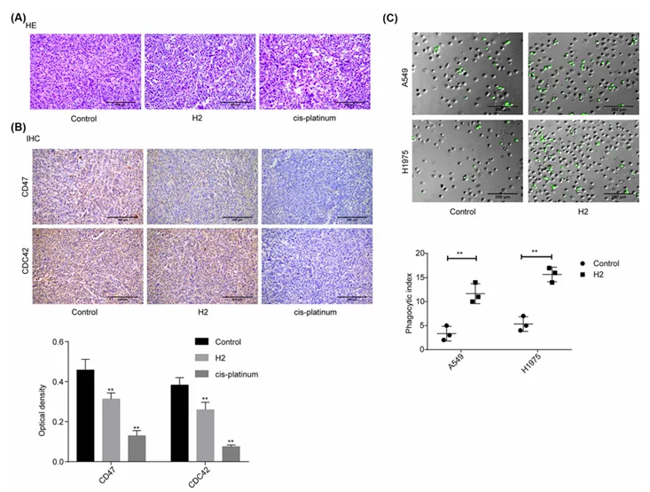 在荷瘤小鼠模型中,吸入H?或注射順鉑均能顯著減輕腫瘤組織的病理損傷(細(xì)胞密度和異型性降低)(圖5A)。與對照組相比,H?組和順鉑組腫瘤組織中CD47和CDC42的表達(dá)均顯著降低(圖5B)。此外,H?處理顯著增強(qiáng)了巨噬細(xì)胞對肺癌細(xì)胞的吞噬作用(圖5C)。