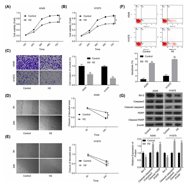 60% H?處理顯著抑制了A549和H1975細(xì)胞的增殖、侵襲和遷移能力(圖1A-E),并誘導(dǎo)了細(xì)胞凋亡(圖1F);伴隨凋亡相關(guān)蛋白的變化:抗凋亡蛋白Bcl-2表達(dá)降低,促凋亡蛋白cleaved caspase3/caspase3和cleaved PARP/PARP比值升高(圖1G)。