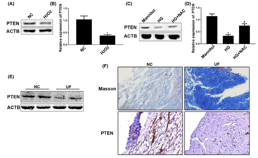 高葡萄糖或過氧化氫處理下調(diào)PTEN蛋白表達,而抗氧化劑N-乙酰半胱氨酸(NAC)或氫處理可逆轉(zhuǎn)這一現(xiàn)象(圖3A-D)。臨床樣本中UF患者腹膜PTEN表達低于NC組(圖3E-F)。