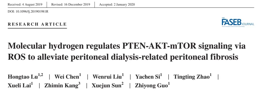 原文題目:Molecular hydrogen regulates PTEN-AKT-mTOR signaling via ROS to alleviate peritoneal dialysis-related peritoneal fibrosis (分子氫通過ROS調(diào)節(jié)PTEN-AKT-mTOR信號通路以緩解腹膜透析相關(guān)的腹膜纖維化)