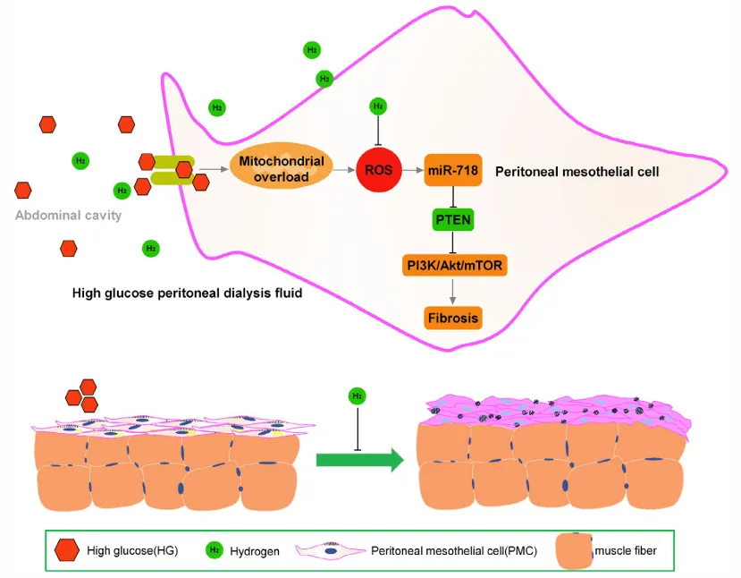 該過程與氧化應激(如活性氧ROS堆積)及纖維化信號通路(如PTEN-AKT-mTOR)的異常JI活密切相關(guān)。分子氫作為一種安全、具有抗氧化特性的小分子氣體,既往研究提示其對多種qi官纖維化有保護作用,但其對腹膜纖維化的具體機制尚不明確。