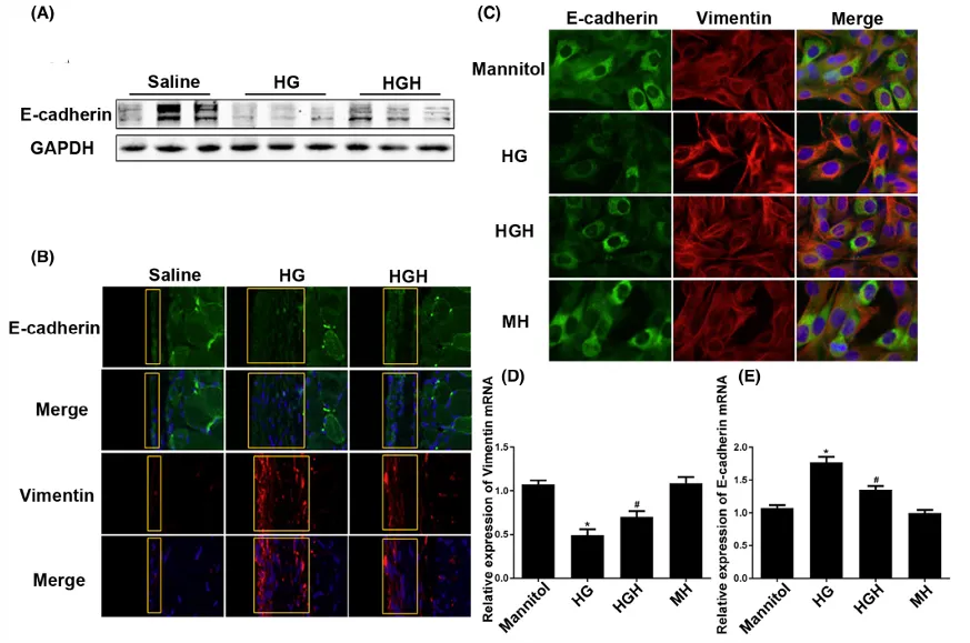 氫處理逆轉(zhuǎn)高葡萄糖引起的E-鈣黏蛋白下調(diào)波形蛋白上調(diào),緩解間皮細胞纖維化轉(zhuǎn)化(圖4A-E)。
