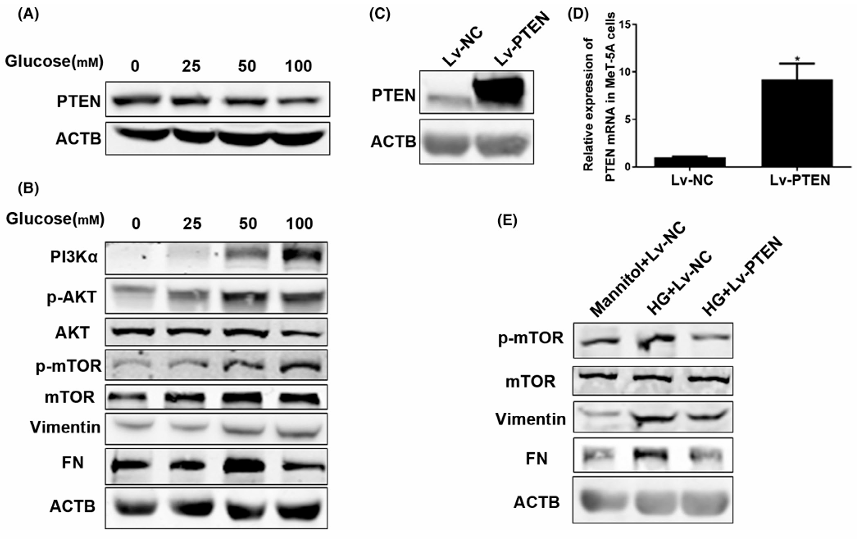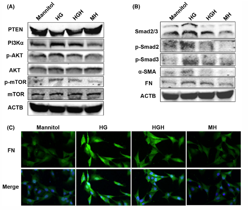 高葡萄糖通過降低PTENJI活PI3K/AKT/mTOR通路,氫處理可抑制該通路及纖維化標志物(如纖維連接蛋白FN)表達。過表達PTEN或氫處理均能緩解mTORJI活和纖維化。