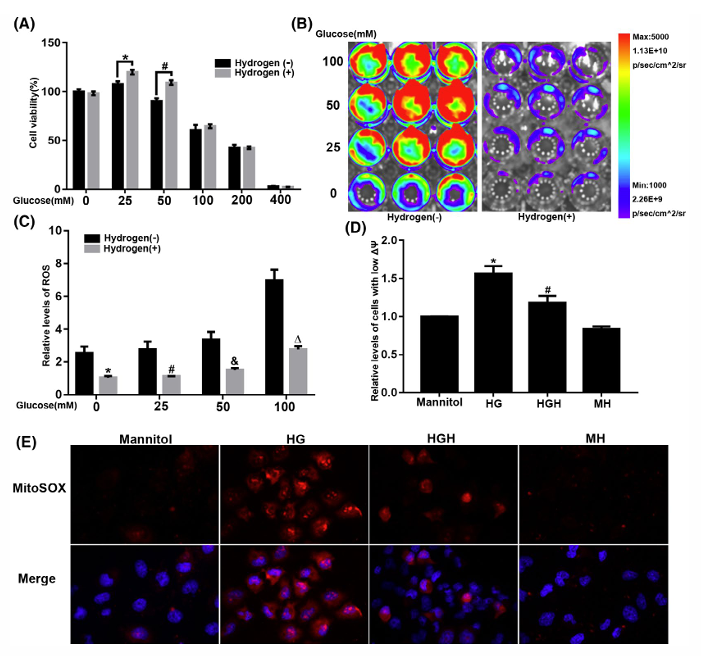 在高葡萄糖刺激的間皮細胞中,氫分子有效降低ROS水平,緩解線粒體膜電位破壞和超氧化物堆積(圖2B-E)。