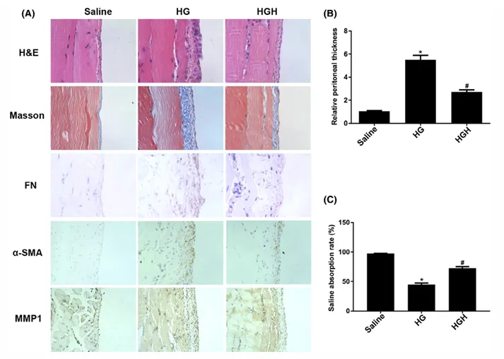 1. 動物模型:使用C57B/L6小鼠,通過腹腔注射4.25%高葡萄糖腹膜透析液(HG)連續(xù)8周誘導腹膜纖維化,設(shè)置鹽水對照組、HG組及富氫HG處理組(HGH)。