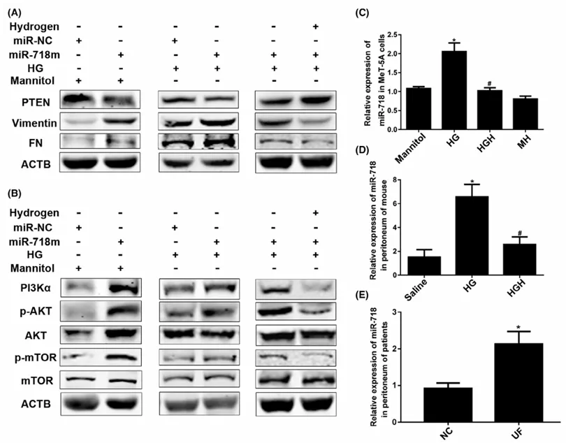 高葡萄糖上調(diào)miR-718(靶向抑制PTEN),氫處理可降低miR-718表達,從而減輕纖維化(圖7A-E)。